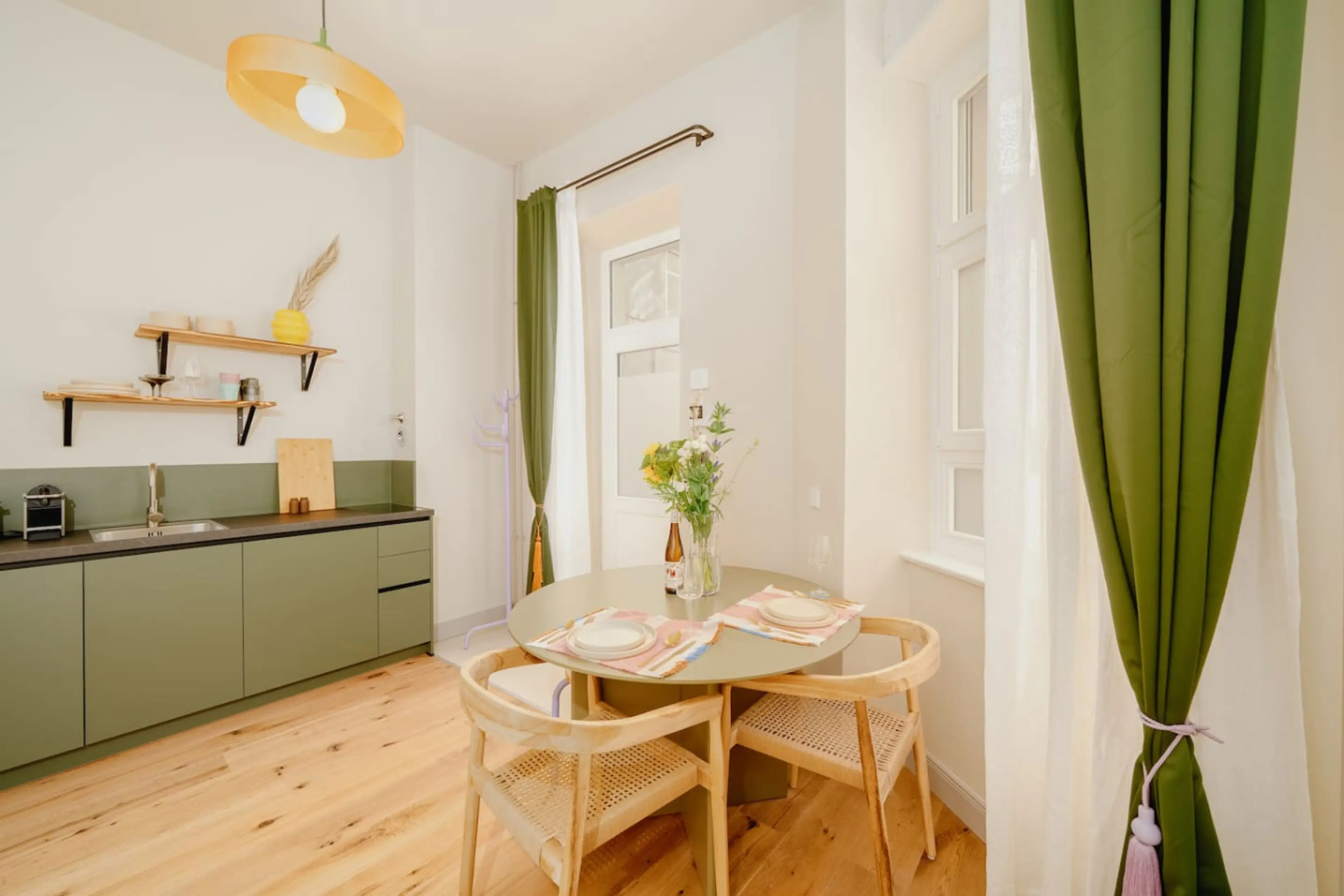 Boutique-Apartment mit Eichenparkett, Beamer, Fußbodenheizung, Designer-Küchenzeile, Kaffeemaschine & 180 × 200 cm Kingsize-Bett, Schlafcouch 140x200 cm. Modernes Bad mit ebenerdiger Regendusche. Keyless Self-Check-in 24/7 via Nuki, 200 Mbit-WLAN. City West direkt am Volkspark: Joggingpfade, Picknic...